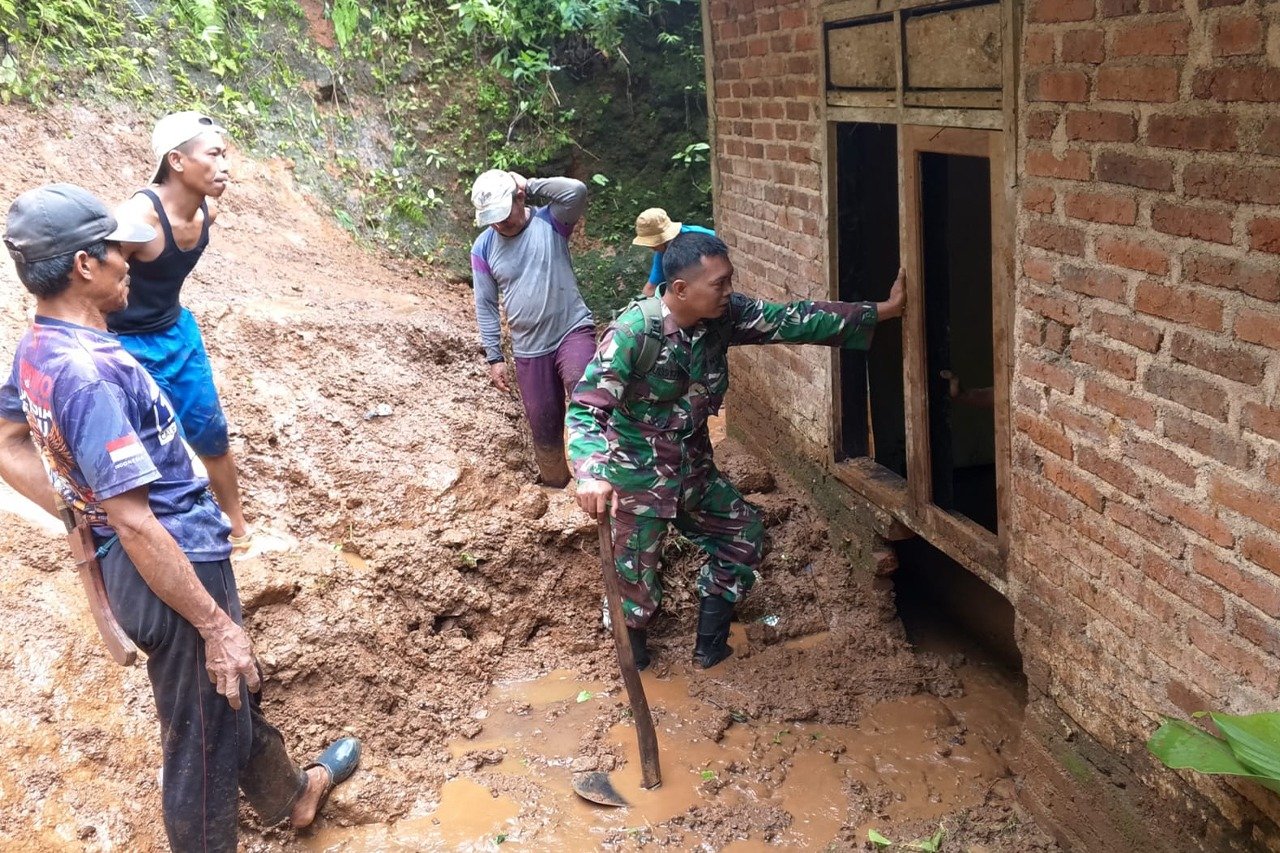 Foto: Babinsa bersama warga membersihkan material tanah longsor yang menimpa rumah warga di Desa Siki, Kecamatan Dongko, Kabupaten Trenggalek, Jawa Timur, Jumat (2/1/2026) Perbesar